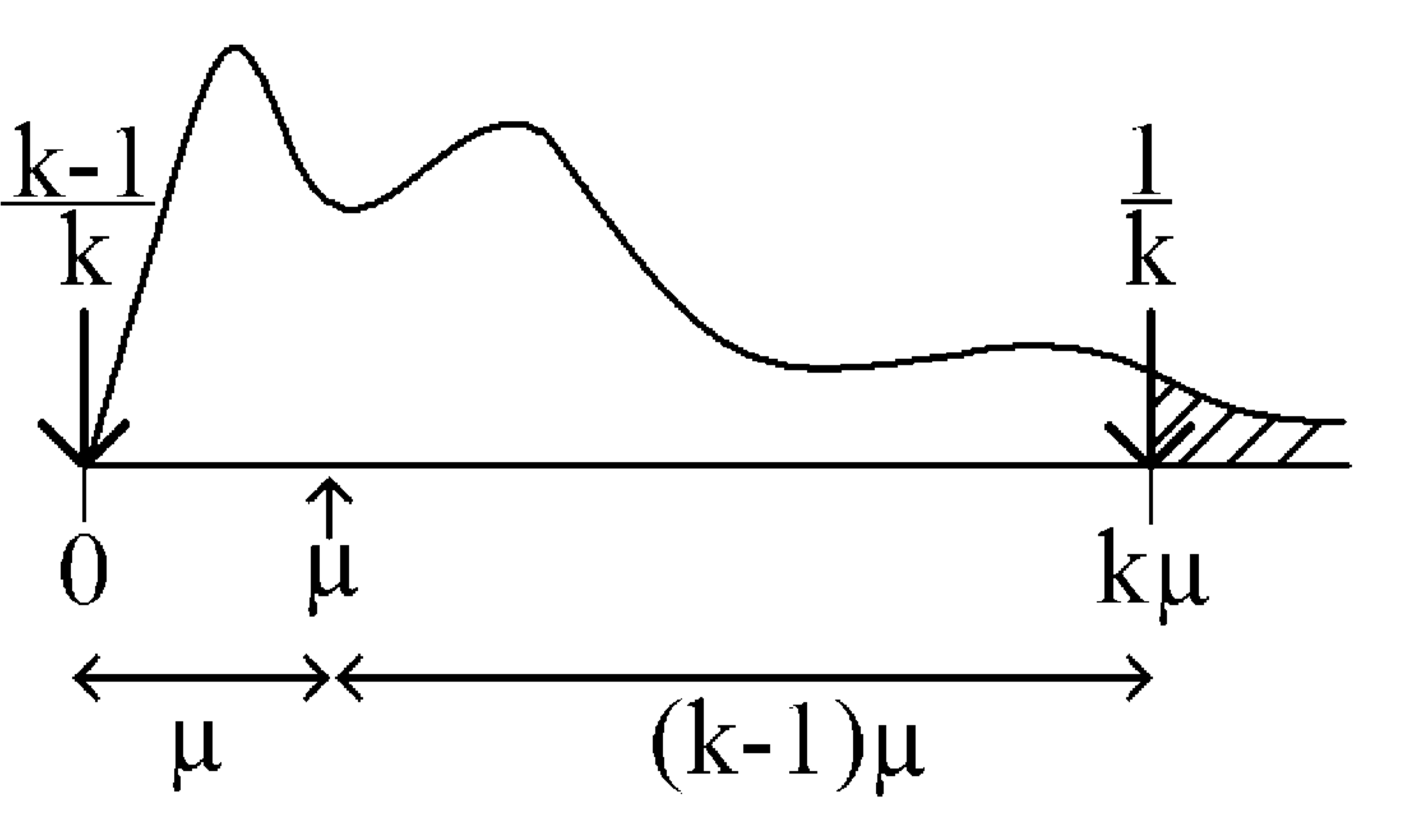 Since the lever arms are in the ratio \(k-1\) to \(1\), a unit weight at \(k \mu\) balances \(k-1\) units of weight at \(0\). So the weights should be \((k-1)/k\) at \(0\) and \(1/k\) at \(k\mu\), which is exactly Markov’s bound with \(\alpha = k\mu\).
